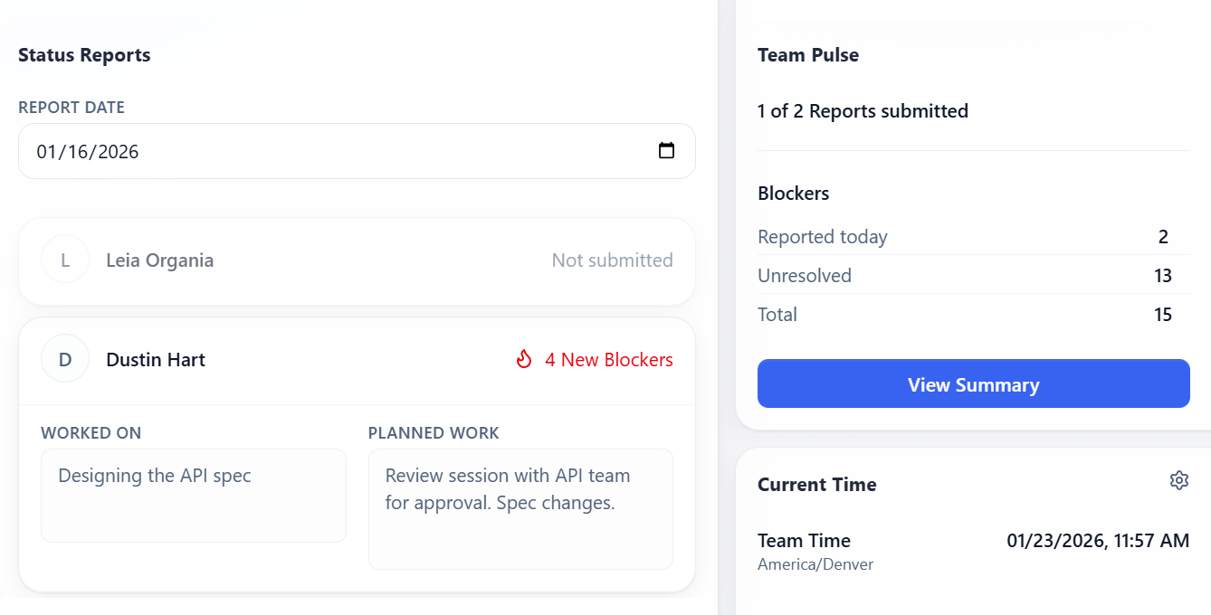 Managers and team leads get a single view that answers one question clearly: What is blocking this team right now? Blockers are ordered by how long they have been open, making stalled work hard to ignore. This works whether you use it in a standup or skip the meeting entirely.